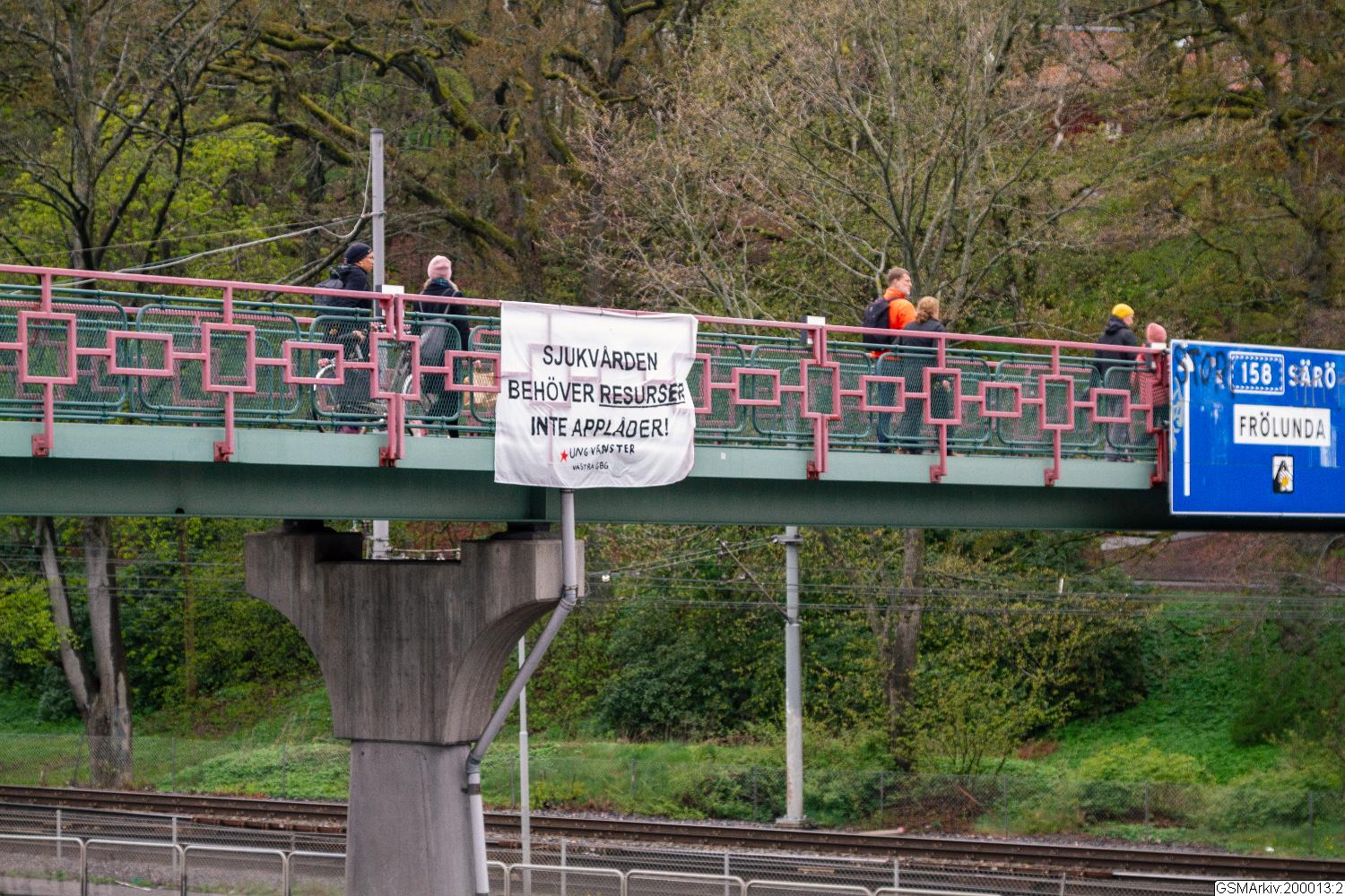 Banderoll på gångbron mellan Slottsskogen och Änggården, 1 maj 2020.