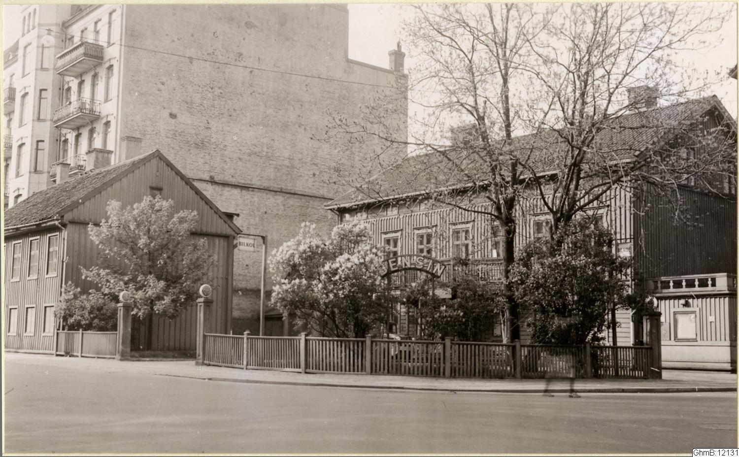 Fotografi som visar Södra vägen 3 och 5, stadens 14 rote nr.11 och 12. På skylten vid infarten står det "bilkol".