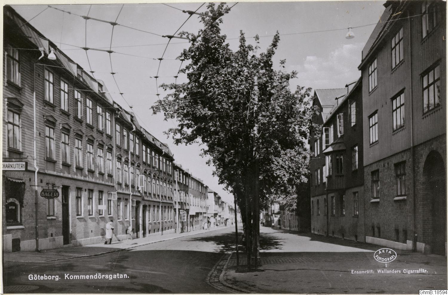 Sträckningsbild Kommendörsgatan norrut, foto taget i höjd med Oljekvarnsgatan. Kontaktledning för trådbuss, linjen gick mellan Jaegerdorrfsplatsen och Järntorget, start i oktober 1940.