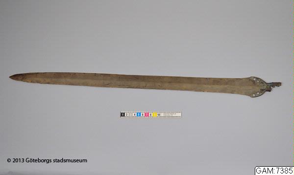 "Svärd av brons med upphöjda kanter utmed fästetungan och nithål i densamma. Övre delen av fästetungan avbruten. Klingan hel, 66 cm l, 3,7cm br. med skarpa kanter. På yttersidorna rester av kitt. Mosspatina. Typ som Montelius: Minnen 1074, 1077" /från katalogkortet