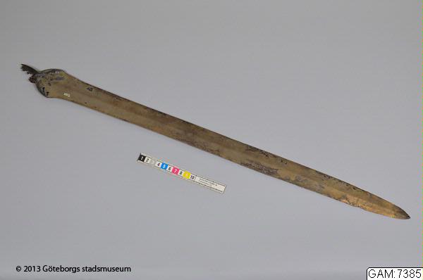 "Svärd av brons med upphöjda kanter utmed fästetungan och nithål i densamma. Övre delen av fästetungan avbruten. Klingan hel, 66 cm l, 3,7cm br. med skarpa kanter. På yttersidorna rester av kitt. Mosspatina. Typ som Montelius: Minnen 1074, 1077" /från katalogkortet