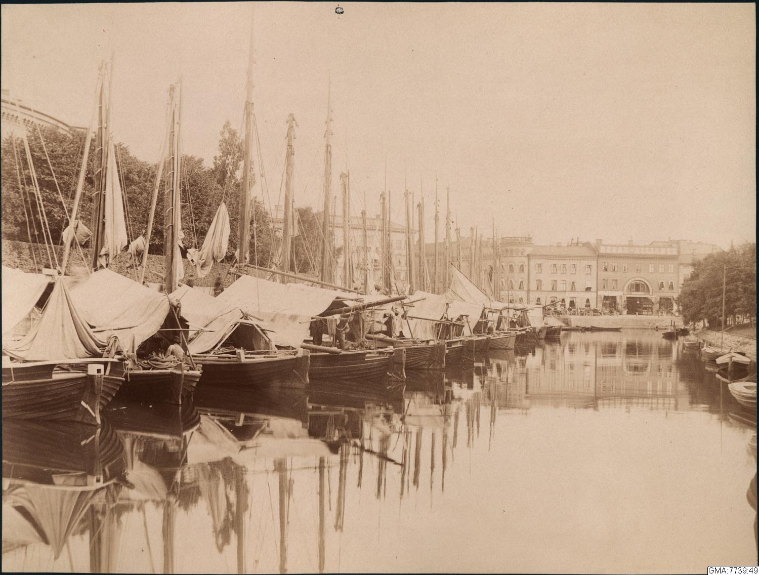 Vallgraven mot Grönsakstorget, vy tagen från Viktoriabron omkring 1890. Tillv änster Sahlgrensgatan och i fonden Basar Alliance vid Basargatan.