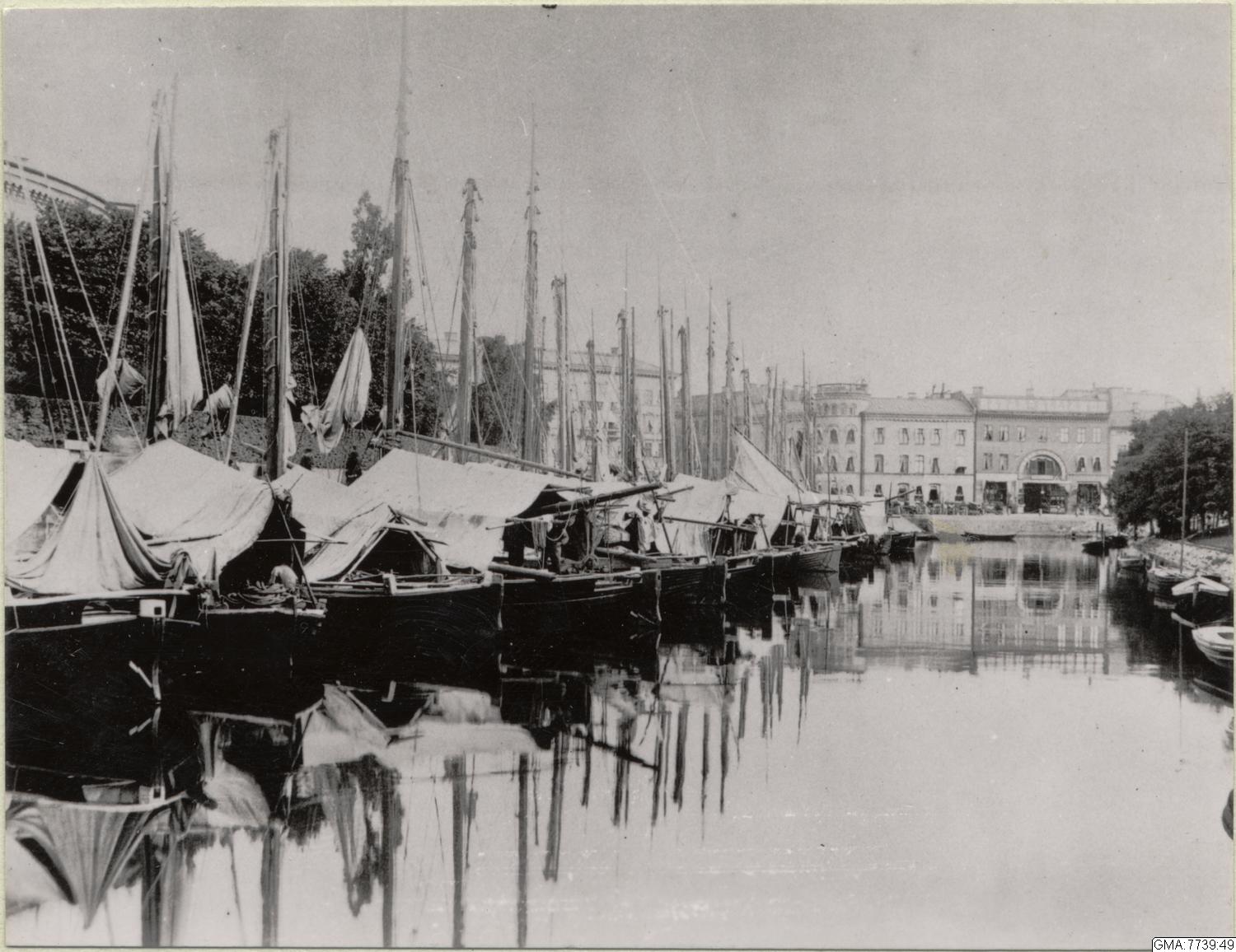 Vallgraven mot Grönsakstorget, vy tagen från Viktoriabron omkring 1890. Tillv änster Sahlgrensgatan och i fonden Basar Alliance vid Basargatan.