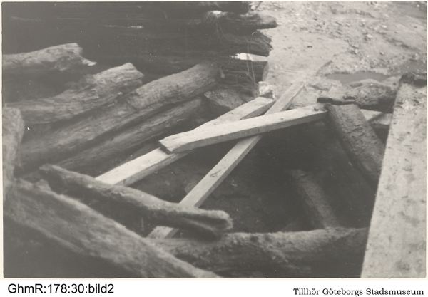 Stockverkets främre (södra) centrala parti sett fr. V. Observera de stockändar i Ö fasaden som avsågats för jordfyllningens skull.