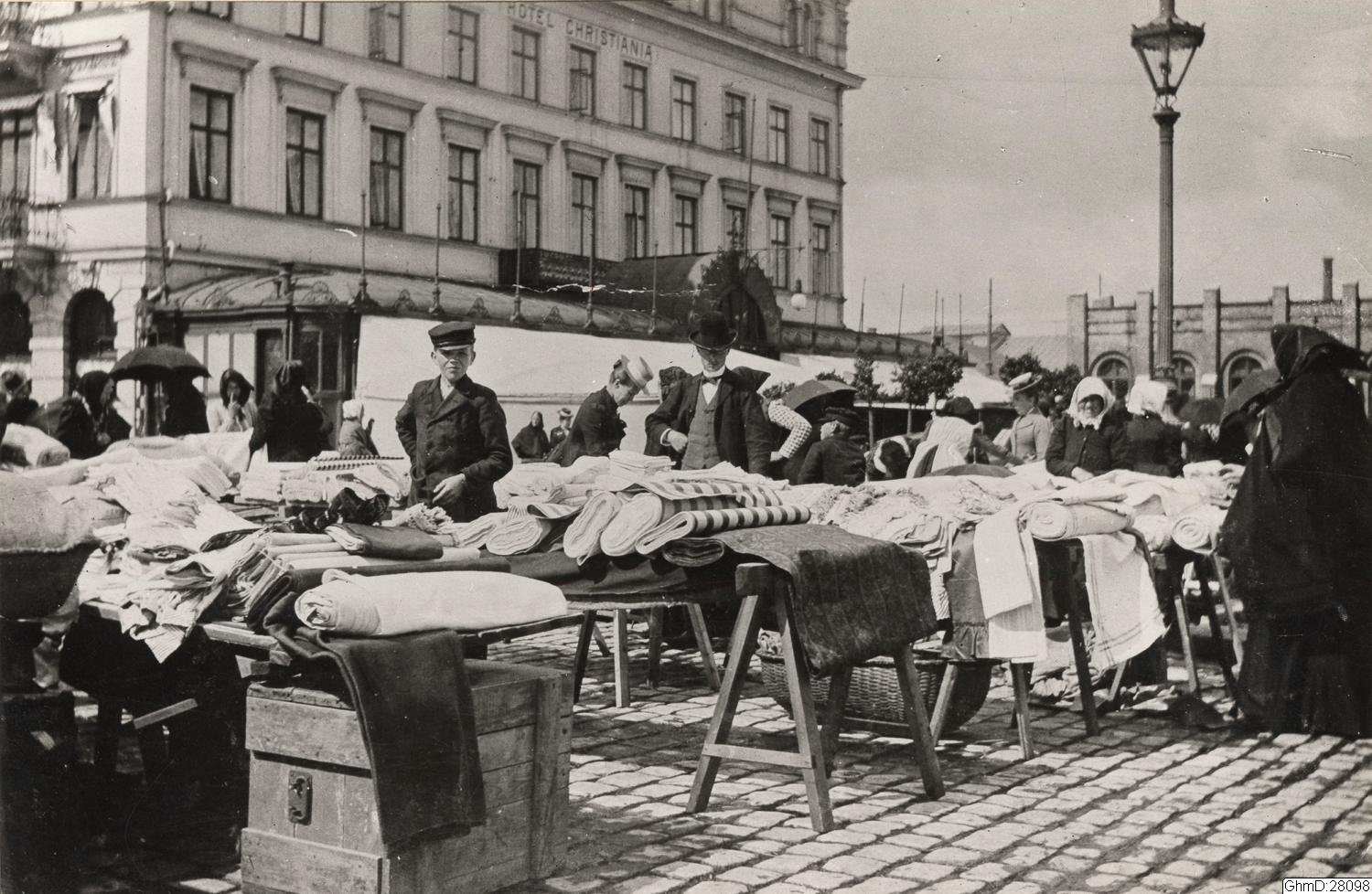 Linnemarknad på drottningtorget framför hotell Eggers.