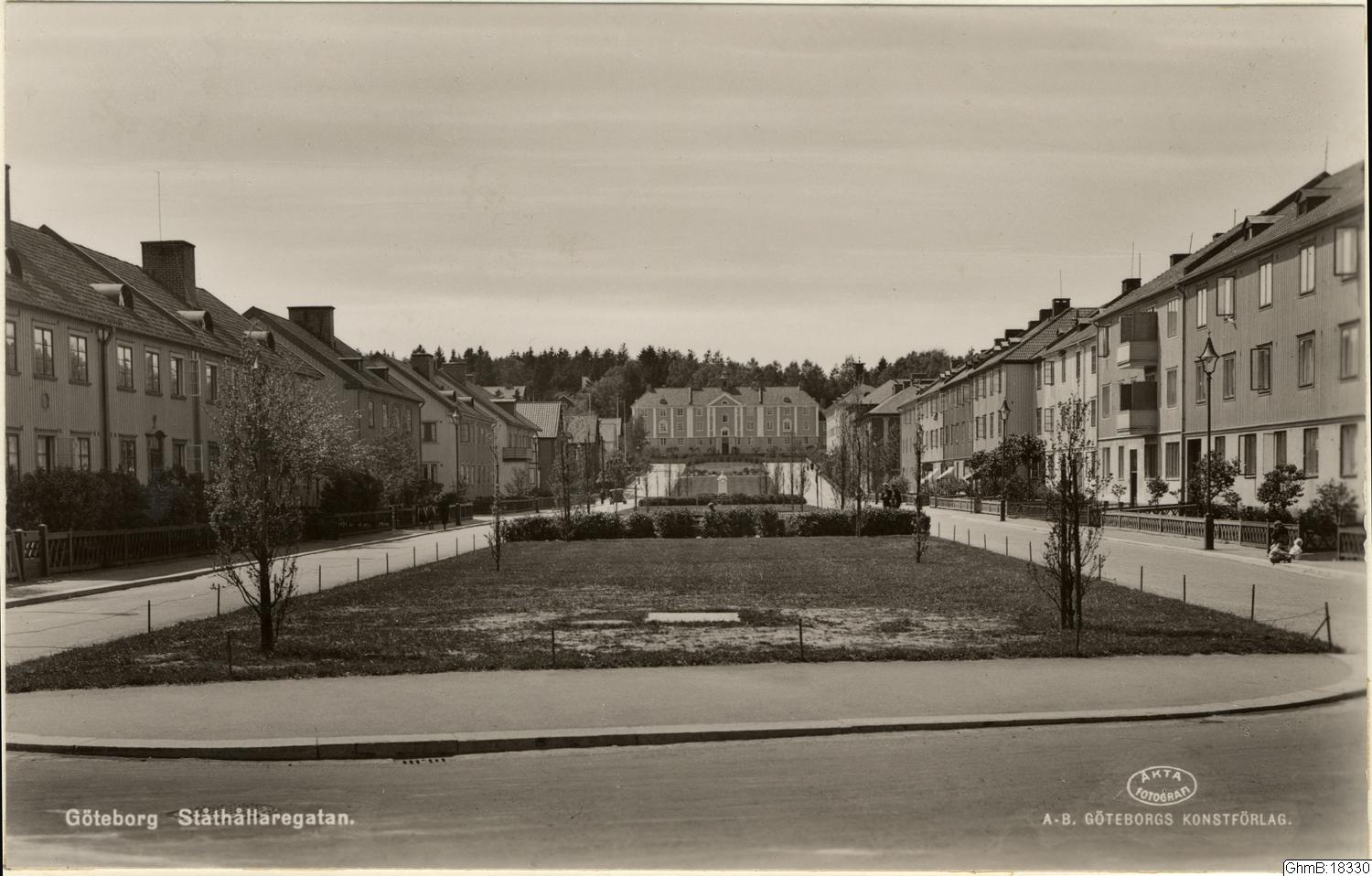 Sträckningsbild Ståthållaregatan väster ut och fondenmed ett av Göteborgs stads pensionärshem vid Fågelfängarevägen 15