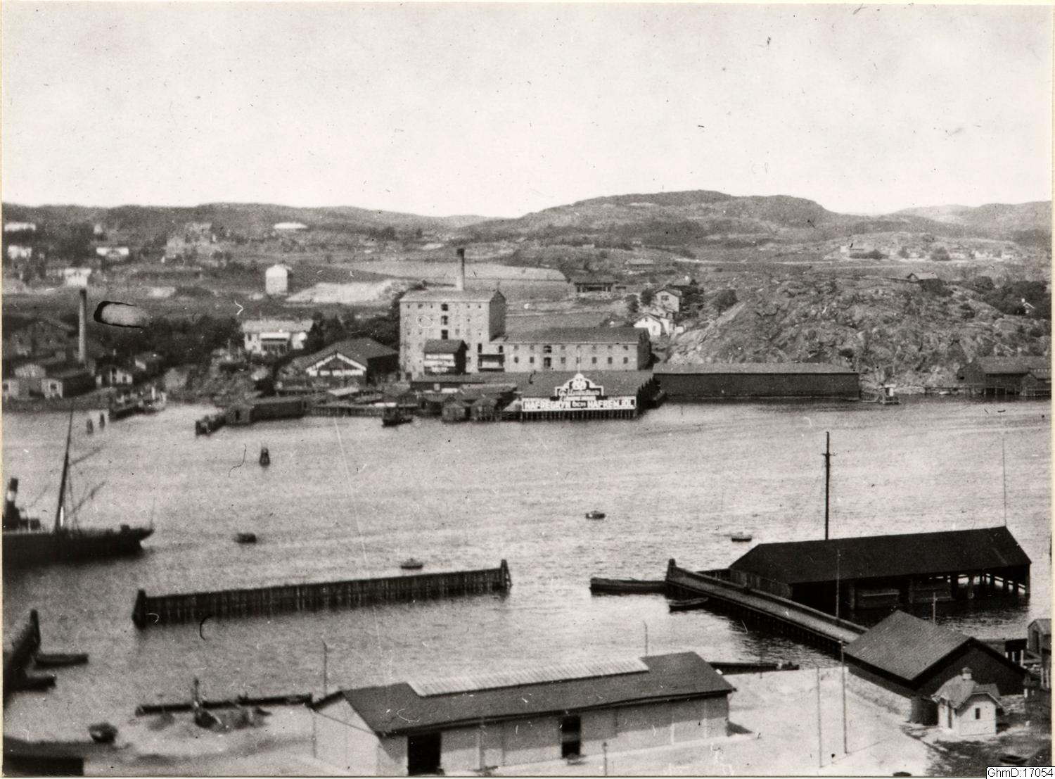 Hamnen, utsikt mot riskvarnen på Hisingen. T.h. badhus vid Sågen.
