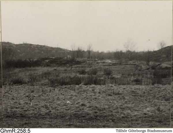 Guldhedsområdet bebygges år 1945. Terrängvy åt nordväst från Änggårdstorpet. Andra bilden från vänster i ett panorama om tre bilder uppklistrade sida vid sida. Hela panoramat är på fem bilder fördelade på två arkivblad.