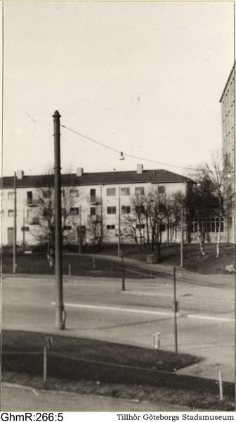 Nyuppförda fastigheter på Guldhedsområdet sedda söderifrån över Guldhedsgatan. Andra bilden från vänster i ett panorama om fem bilder upplistrade sida vid sida.