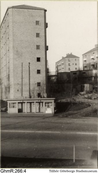 Nyuppförda fastigheter på Guldhedsområdet sedda söderifrån över Guldhedsgatan. Tredje bilden från vänster i ett panorama om fem bilder upplistrade sida vid sida.