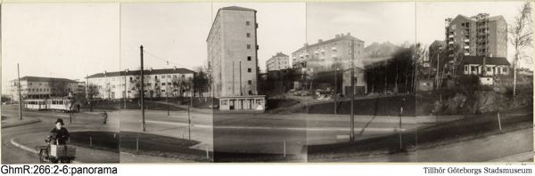 Nyuppförda fastigheter på Guldhedsområdet sedda söderifrån över Guldhedsgatan. Första bilden från vänster i ett panorama om fem bilder upplistrade sida vid sida.