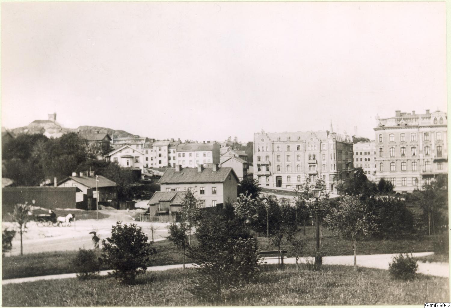 "Engelbrektsgatan mellan Molinsgatan och Aschebergsgatan / omkring 1890. / Hörnet av Engelbrektsgat. och Erik Dahlbergsg. är uppfört 1890 och husen där bortom 1891. Vattenreservoiren i Landala är uppförd 1893. Hörnet Eng. & Aschebergsg. uppf. 1888." Information från originalfotot