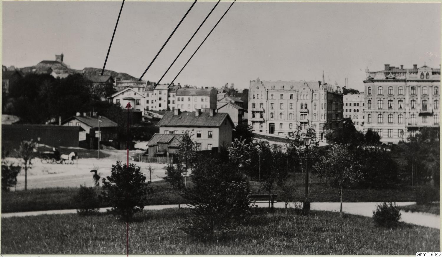 "Engelbrektsgatan mellan Molinsgatan och Aschebergsgatan / omkring 1890. / Hörnet av Engelbrektsgat. och Erik Dahlbergsg. är uppfört 1890 och husen där bortom 1891. Vattenreservoiren i Landala är uppförd 1893. Hörnet Eng. & Aschebergsg. uppf. 1888." Information från originalfotot