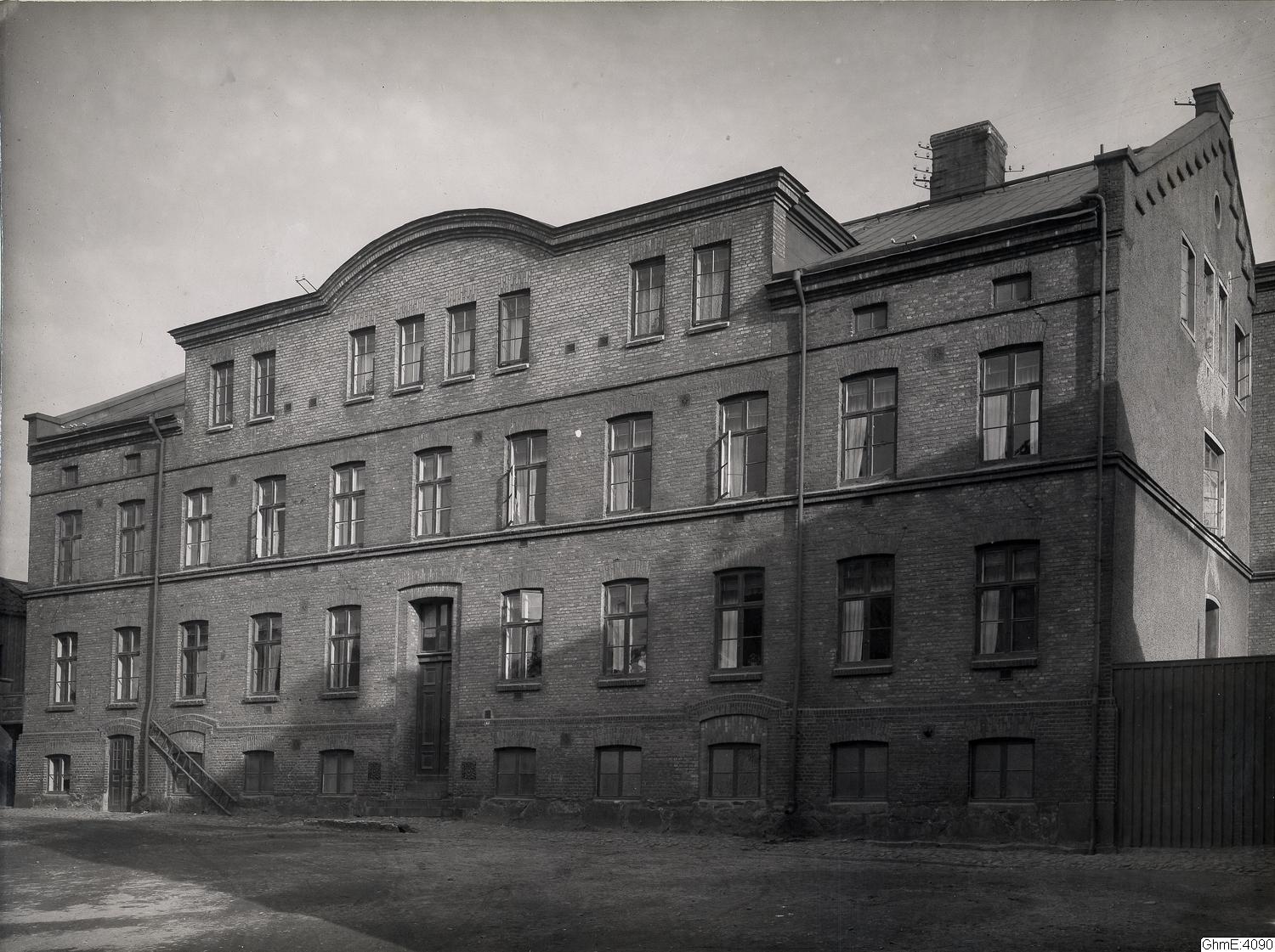 Majornas barnhem vid Timmermansplatsen 1906. Byggnaden är från 1861 och var fram till 1906 arbets- och fattighus, från 1930 ca Majornas sjukhus. Bygnaden revs 1962