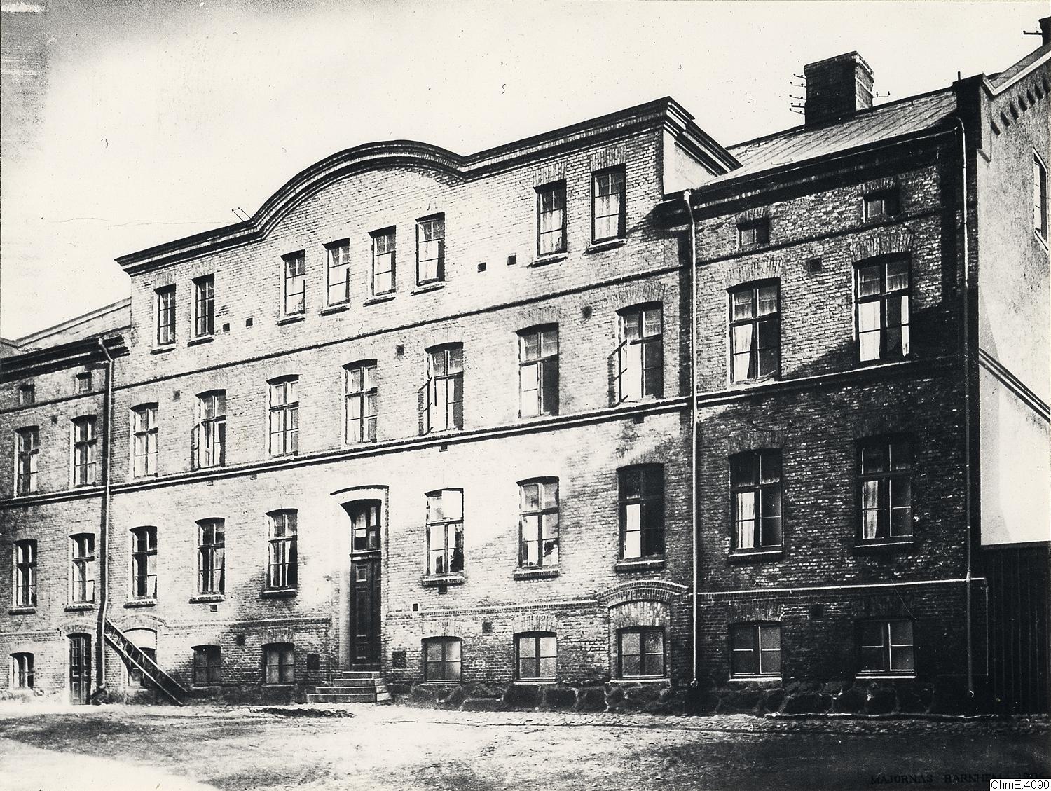 Majornas barnhem vid Timmermansplatsen 1906. Byggnaden är från 1861 och var fram till 1906 arbets- och fattighus, från 1930 ca Majornas sjukhus. Bygnaden revs 1962