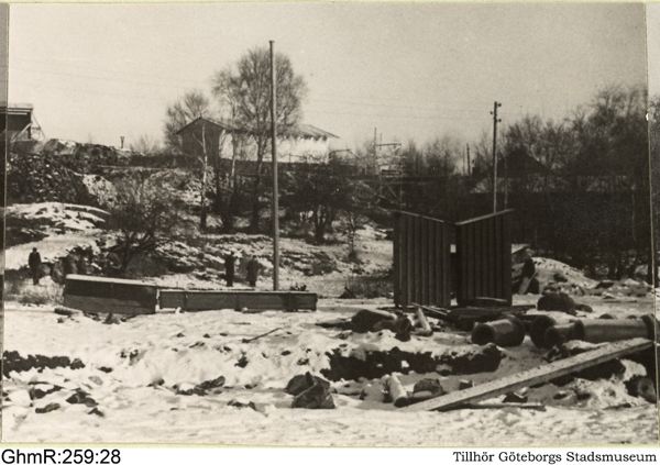 Från byggnadsverksamheten på Guldhedsområdet under förra hälften av år 1945. Rundvy norrut. Tredje bilden från vänster i ett panorama om fyra bilder uppklistrade sida vid sida.