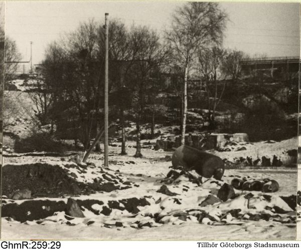 Beskrivning: Från byggnadsverksamheten på Guldhedsområdet under förra hälften av år 1945. Rundvy norrut. Andra bilden från vänster i ett panorama om fyra bilder uppklistrade sida vid sida.