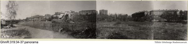 Första bilden från vänster i ett panorama om fyra bilder uppklistrade sida vid sida över Norra Guldheden m.m. Vy tagen från Södra Guldheden.