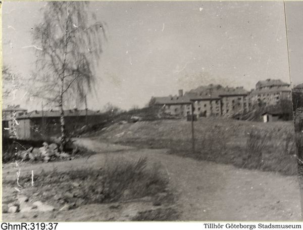 Första bilden från vänster i ett panorama om fyra bilder uppklistrade sida vid sida över Norra Guldheden m.m. Vy tagen från Södra Guldheden.