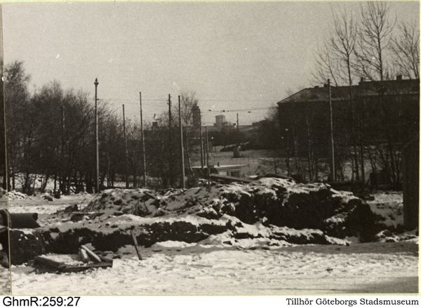 Från byggnadsverksamheten på Guldhedsområdet under förra hälften av år 1945. Rundvy norrut. Fjärde bilden från vänster i ett panorama om fyra bilder uppklistrade sida vid sida.