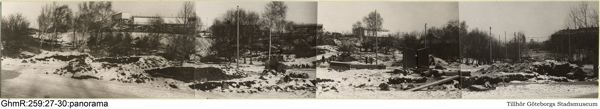 Från byggnadsverksamheten på Guldhedsområdet under förra hälften av år 1945. Rundvy norrut. Fjärde bilden från vänster i ett panorama om fyra bilder uppklistrade sida vid sida.