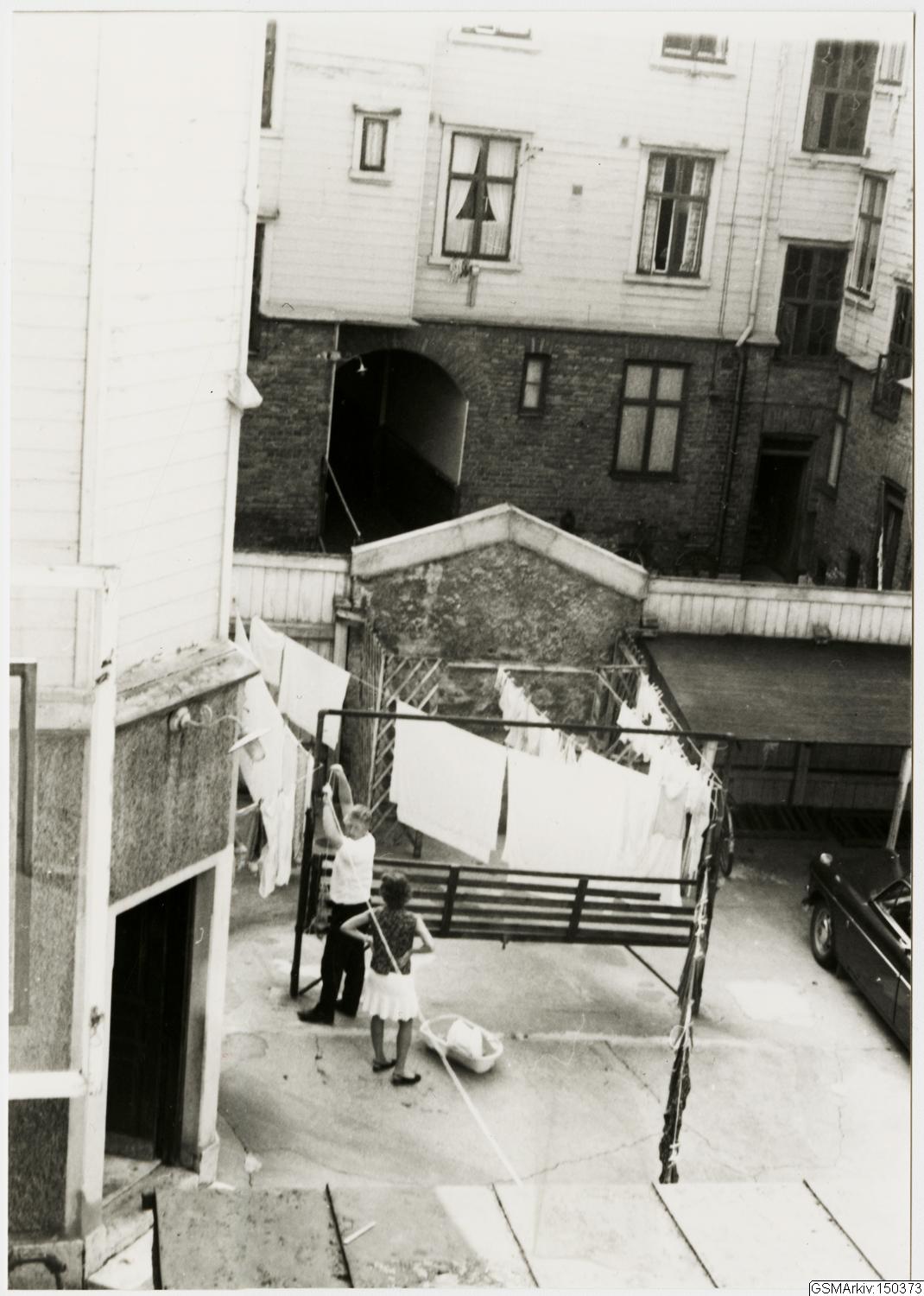 Bilden visar en innergård i Landala, med ett par människor som hänger tvätt. Avgränsning mot nästa gård med plank.