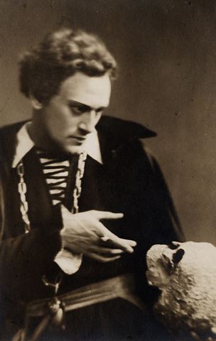 Gabriel Alw som Hamlet. Föreställningsbild från Lorensbergsteaterns uppsättning i regi av Per Lindberg, med premiär 14 oktober 1920.