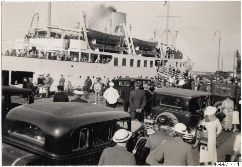 Okänt fartyg för persontrafik ligger vid Stigbergskajen. Fören med namn syns inte på fotot.