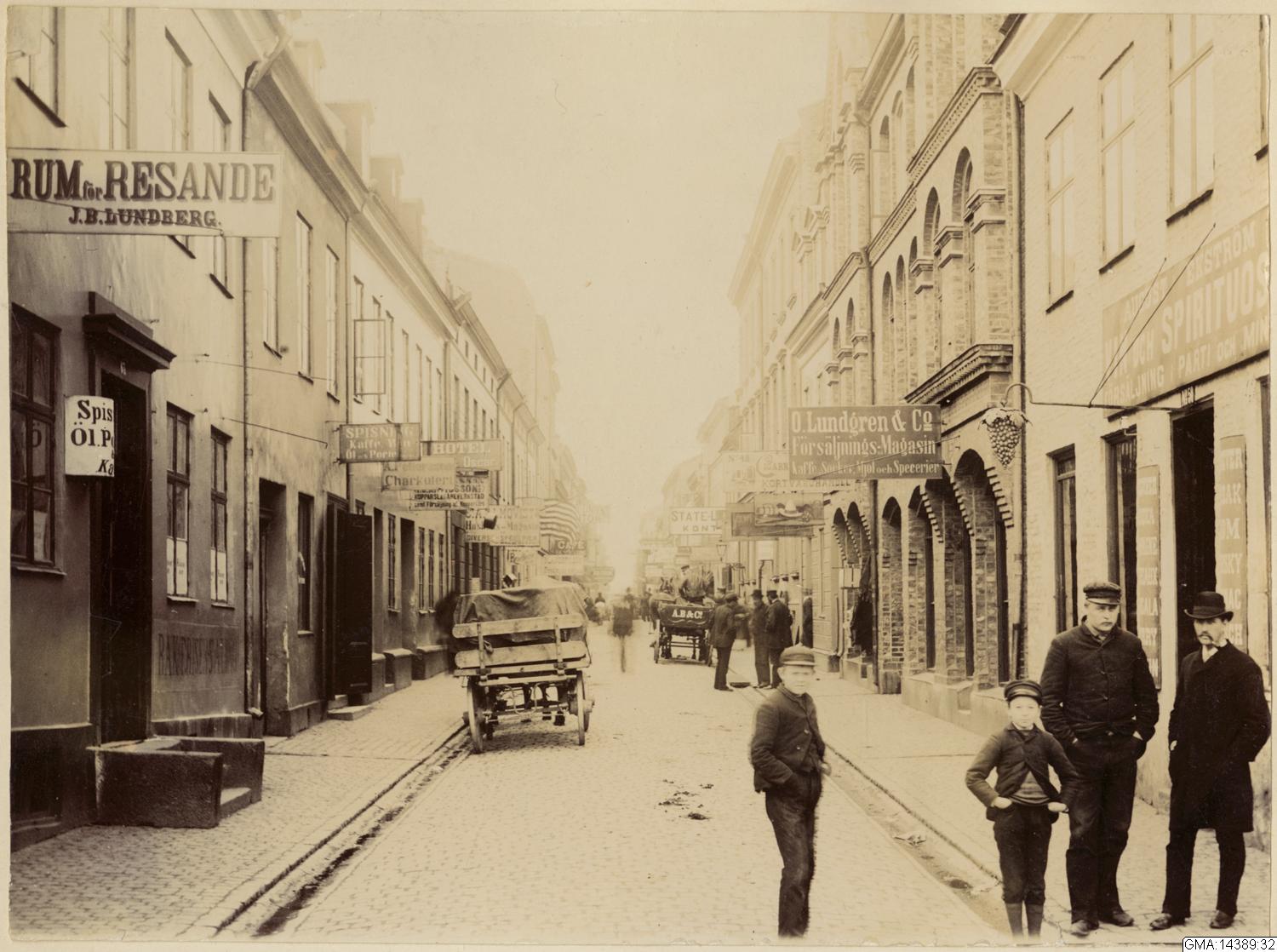 Sträckningsbild Sillgatan/Postgatan mot väster. Sillgatan var känd som emigranternas gata, här fanns det som behövdes för Amerikaresan. På båda sidor av gatan ligger butiker, rederier samt hotell och rum för uthyrning.