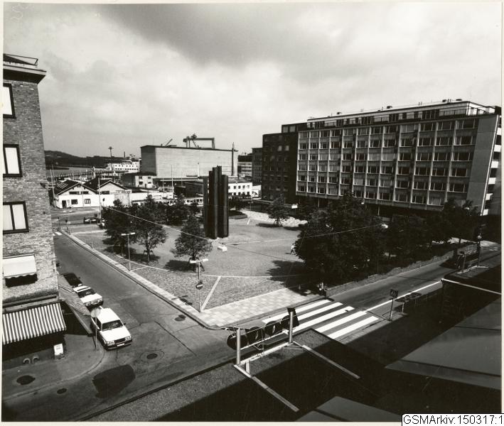Översiktbild över Masthuggstorget, taget från Masthuggsterassen. mitt på torget skulpturen Masterna, från 1971. De 6 masterna är av tjärad furu.