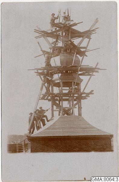 Svartvit bild med montering av tornhuv på Nordhemsskolan