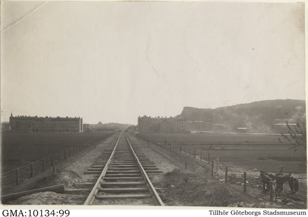 Sannegårdsbanan, parti mot väster - blick ungefär från Kvillegatan. T.h. i fonden Ramberget.