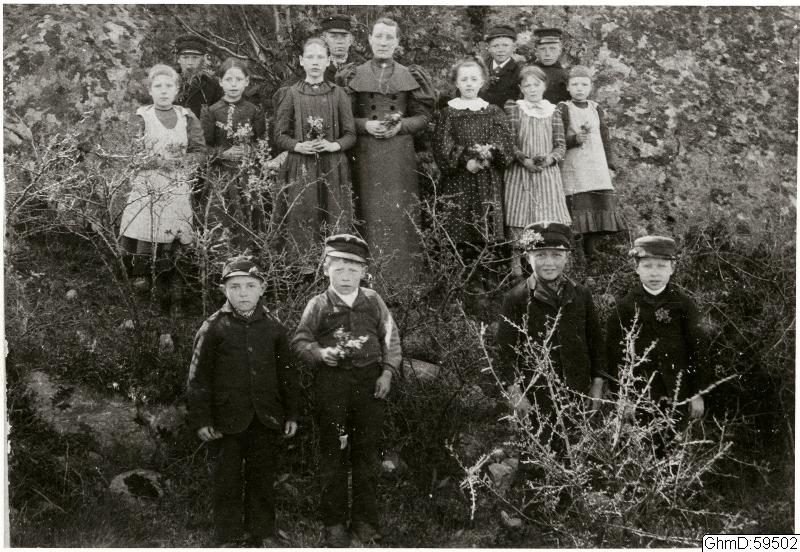 Foto med skolbarn och lärarinna Anna Axelsson på Köpstadsö. Klassen ute i det fria. Barnen och Anna Axelsson har blommor i hnänderna, några av pojkarna har blommor i mössorna.