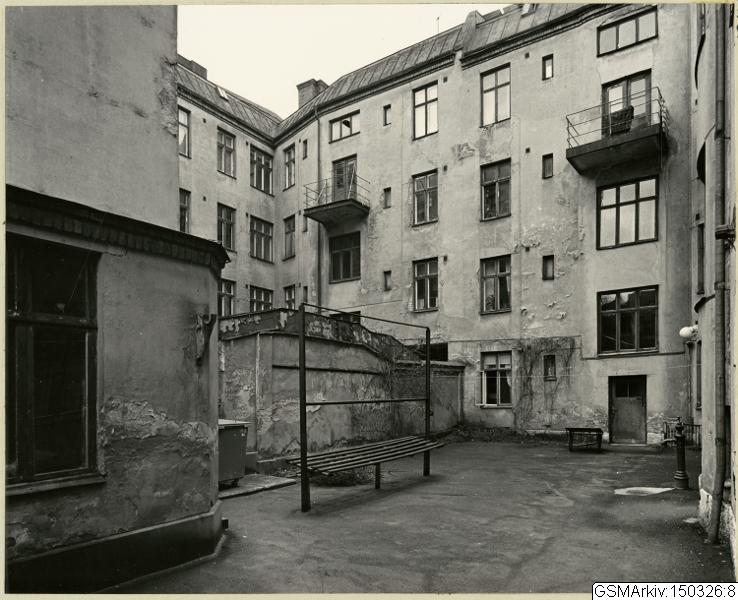 Innergården till Tredje Långatan 24. Stenhus i 4 våningar. Gårdsfasaden i ljus puts.Stenmur mot intilliggande gård.