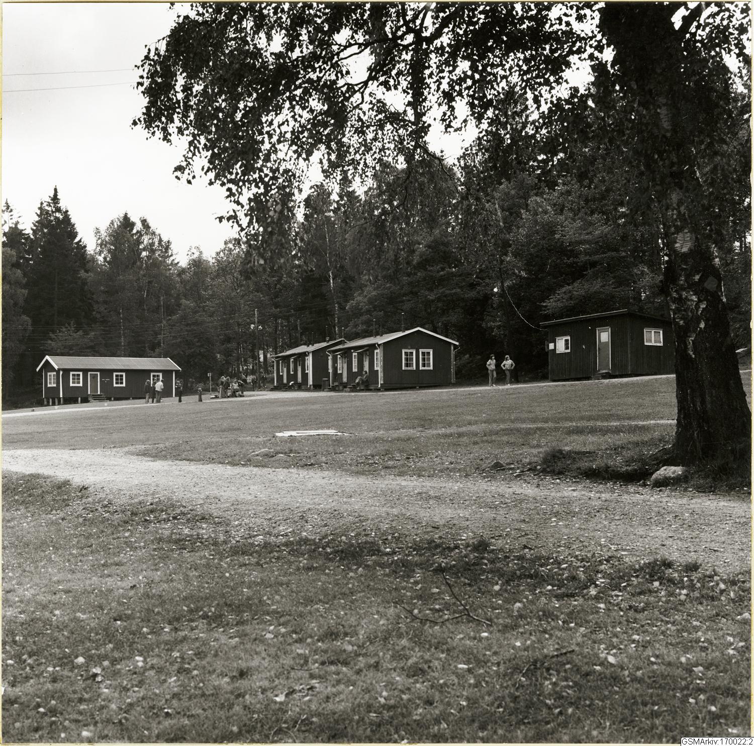 Skatås Friluftsgård med byggnader från 1940-talet. På den öppna plasten framför stugorna syns aktivitet. Byggnaderna uppfördes som militärbaracker under andra världskriget. De kom senare att användas för de flyktingar som kom till Göteborg med de Vita bussarna.