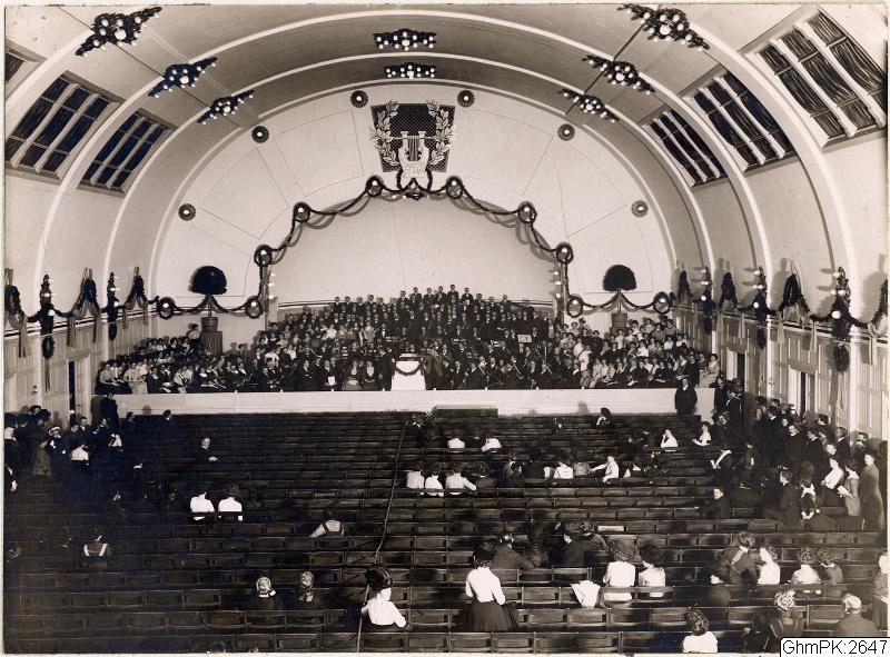 Interiörbild av Gamla Konserthuset på Heden, med orkester och ev kör på scen och publik i salongen.