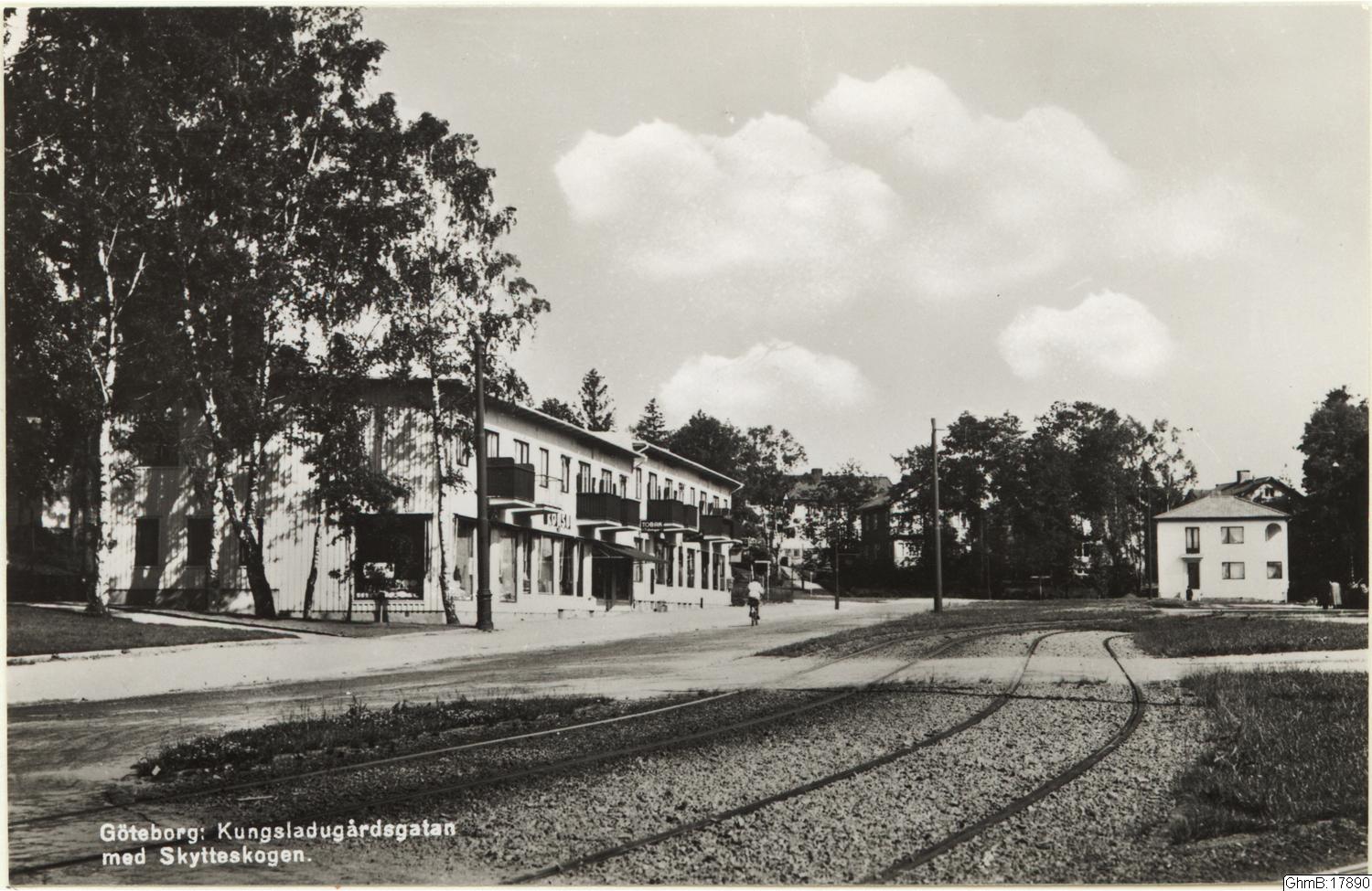 Sträckningsbild med Kungsladugårdsgatan söderut. Till vänster Skytteskogen