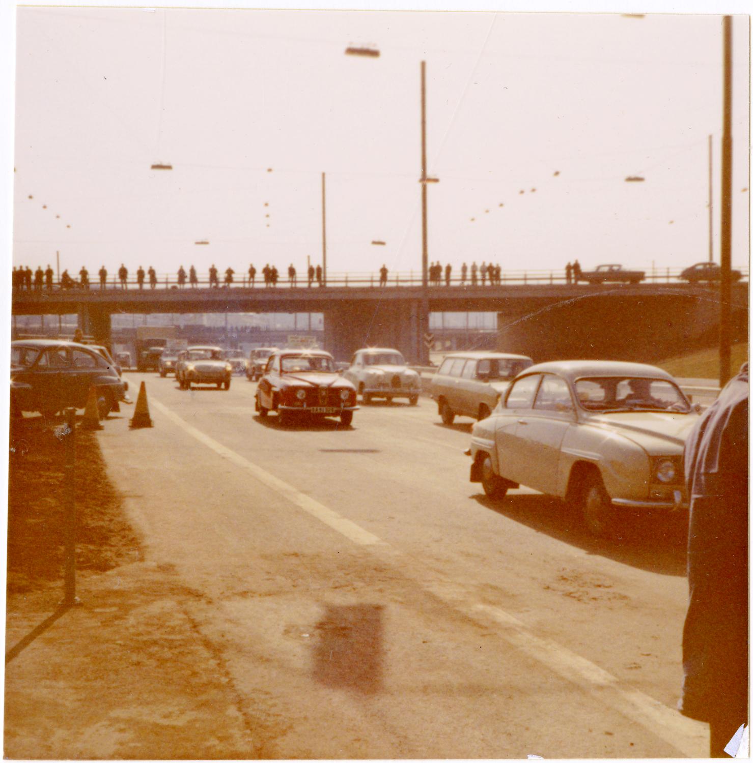Bilden från invigningen av Tingstadstunneln, trafiken släpps på vid södra mynningen.