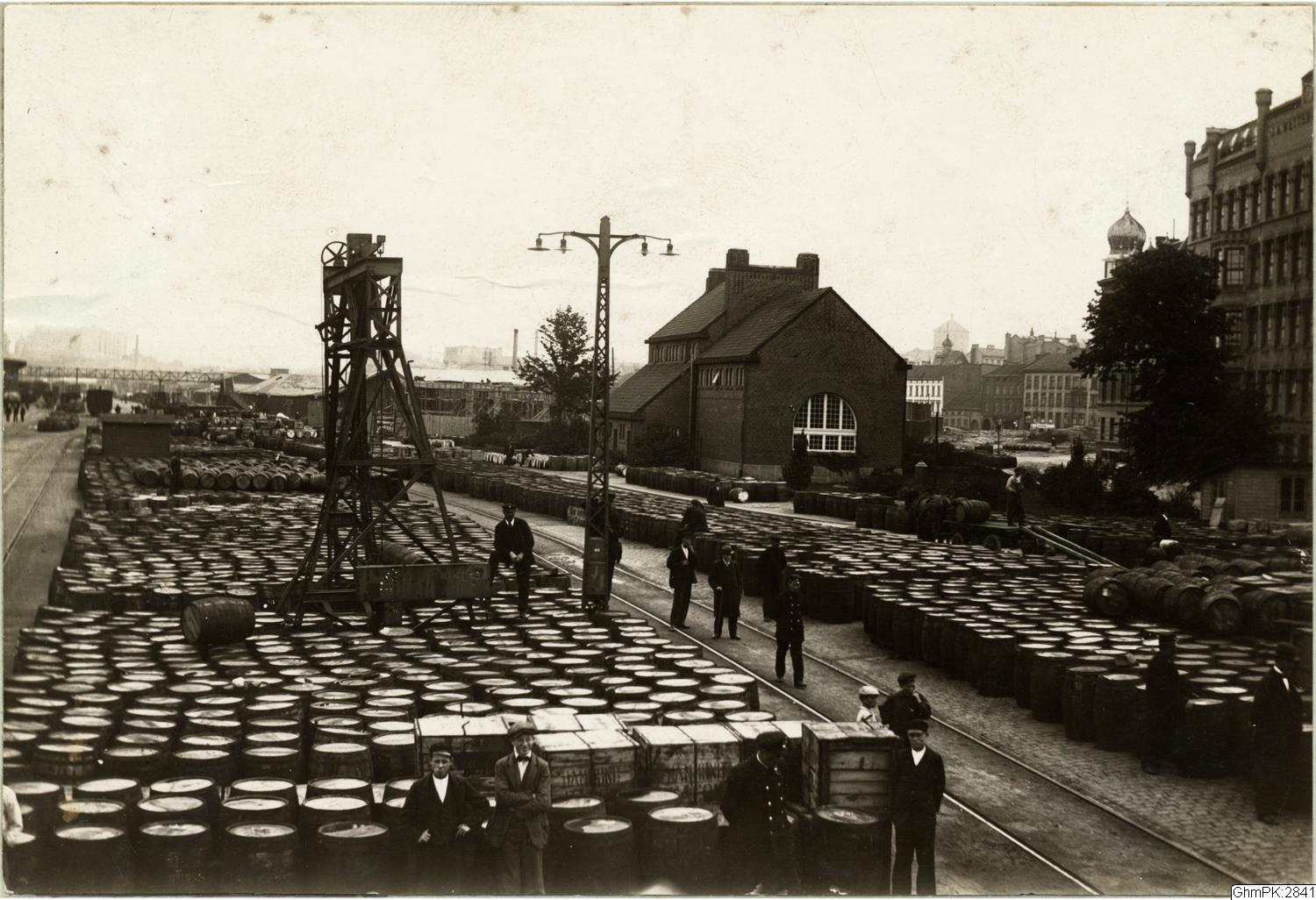 Göteborgs hamn. Oljefatsupplag år 1915.