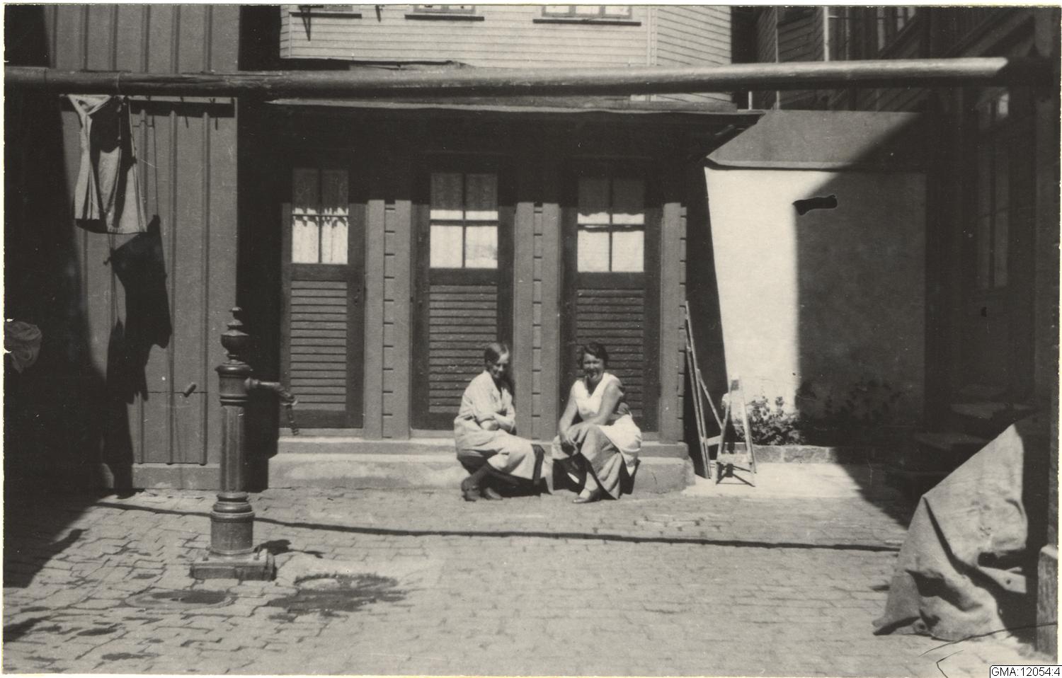 Gårdsinteriör från Östra Skansgatan 26 med 2 kvinnor sittande i solen.