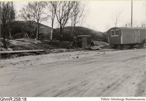 Guldhedsområdet bebygges år 1945. Vy från en av de ej helt iordningställda gatorna. Andra bilden från vänster i ett panorama om fyra bilder uppklistrade sida vid sida. Panoramat är en del av en hel rundvy om tretton bilder fördelade på fyra arkivblad.