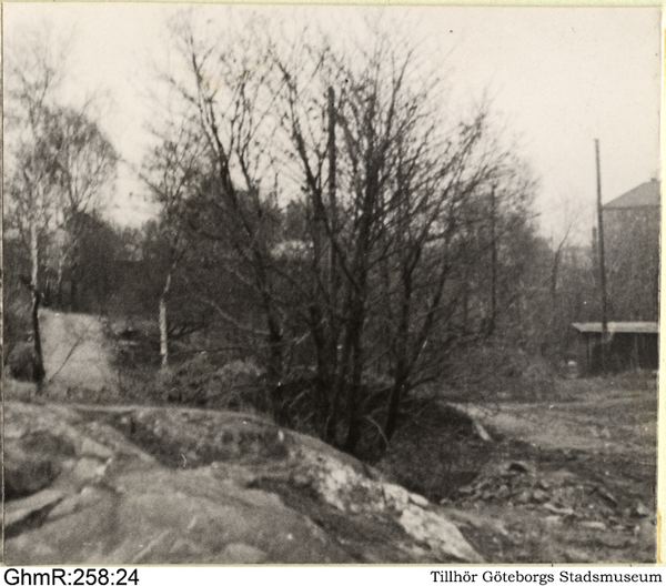 Guldhedsområdet bebygges år 1945. Vy från en av de ej helt iordningställda gatorna. Fjärde bilden från vänster i ett panorama om fyra bilder uppklistrade sida vid sida. Panoramat är en del av en hel rundvy om tretton bilder fördelade på fyra arkivblad.