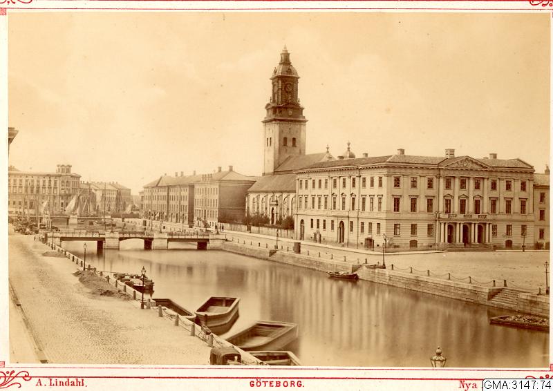 Sträckningsbild längs Stora Hamnkanalen och Norra Hamngatan. Till vänster synd en del av Gutaf Adolfs torg. I fonden Lilla Torget och Wijkska huset