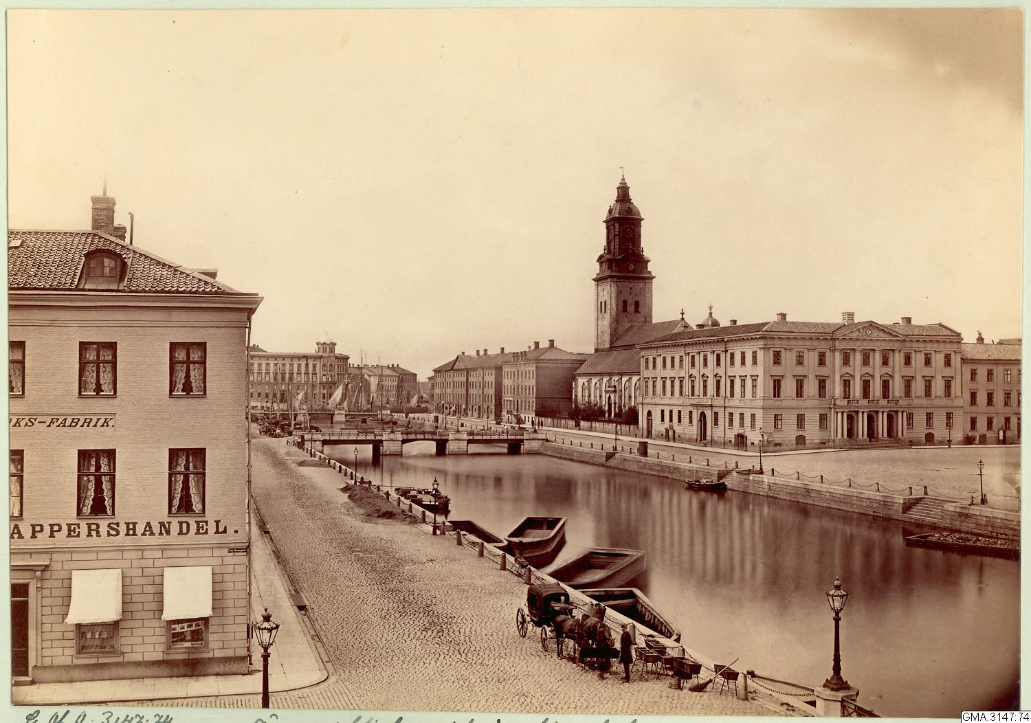 Sträckningsbild längs Stora Hamnkanalen och Norra Hamngatan. Till vänster synd en del av Gutaf Adolfs torg. I fonden Lilla Torget och Wijkska huset