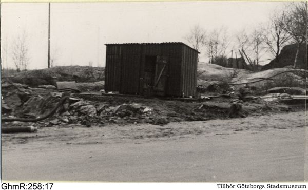 Guldhedsområdet bebygges år 1945. Vy från en av de ej helt iordningställda gatorna. Första bilden från vänster i ett panorama om fyra bilder uppklistrade sida vid sida. Panoramat är en del av en hel rundvy om tretton bilder fördelade på fyra arkivblad.