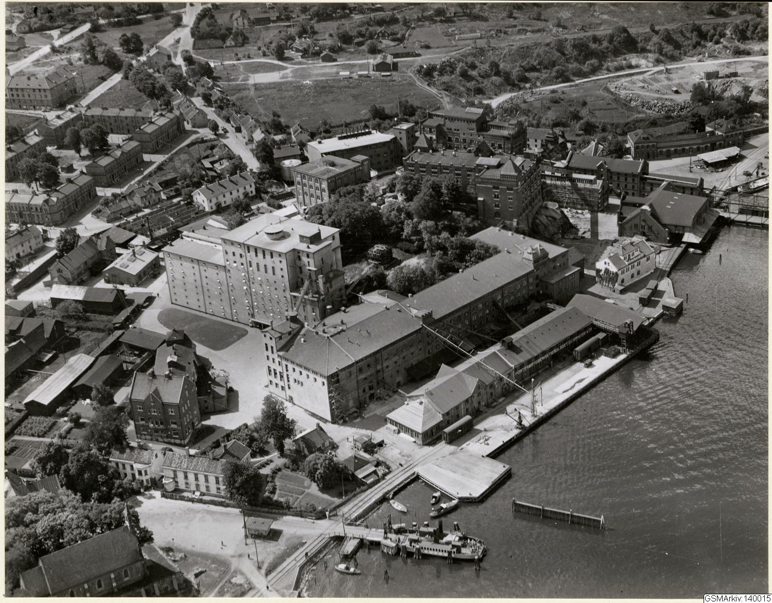 Flygfoto över Klippanområdet med Carnigieska Bruket och Klippans färjeläge. Mitt bland byggnaderna ligger ruinen av Gamla Älvsborgs fästning