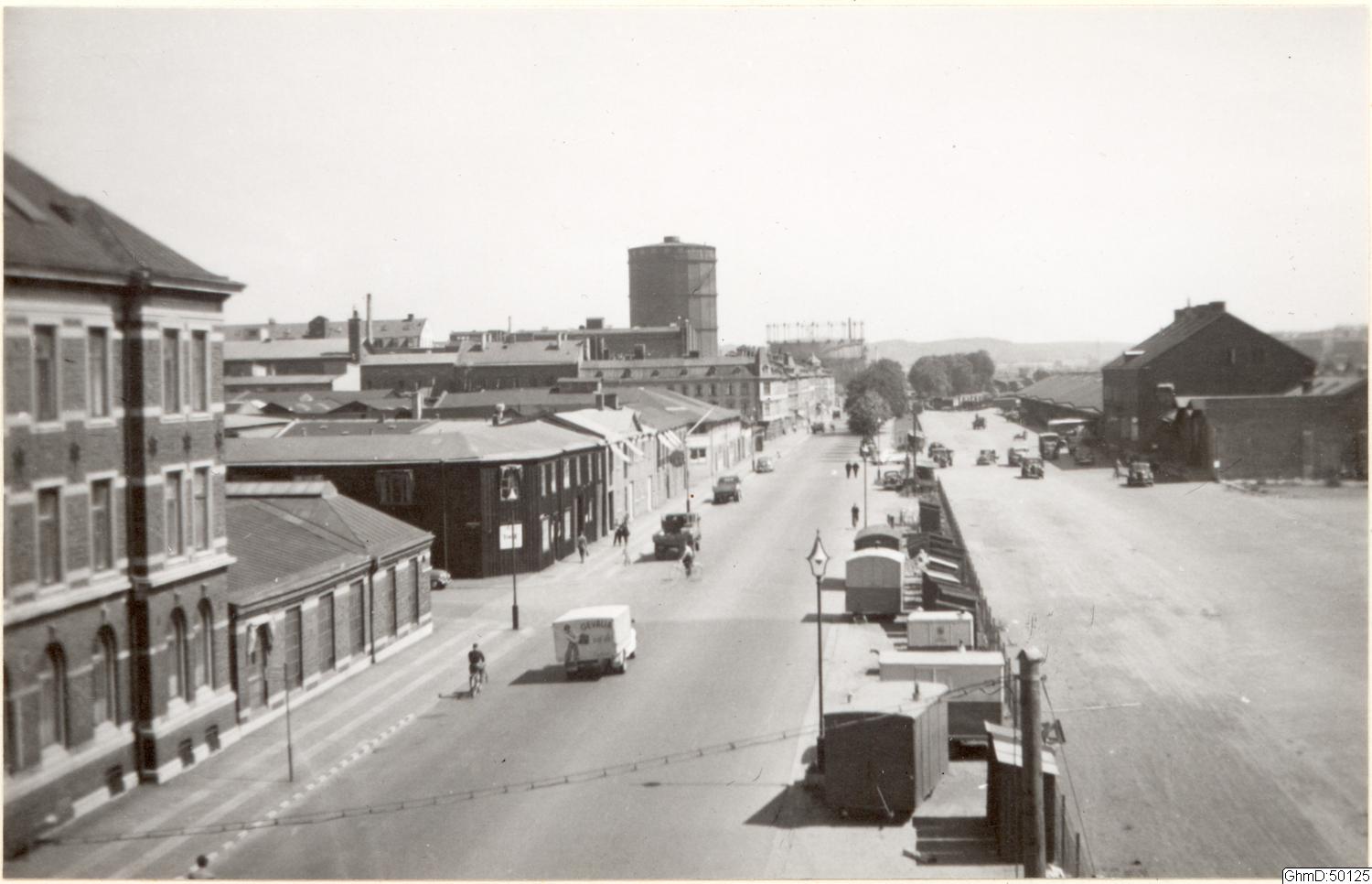 Sträckningsbild, Mårten Krakowgatan västerut. Längs gatan olika verksamheter och bostadshus. I fonden Gasklockan.
