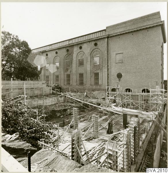 Svartvitt foto, som visar baksidan av konstmuseet under arbetet med Falkhallen