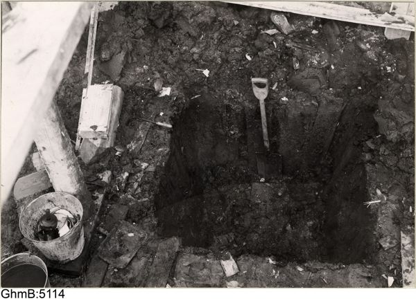 Brunn, skonad med kantställda bräder. På denna plats gjordes fyndet av keramik, glas m.m. Sakerna hade troligen blivit nedkastade däruti.