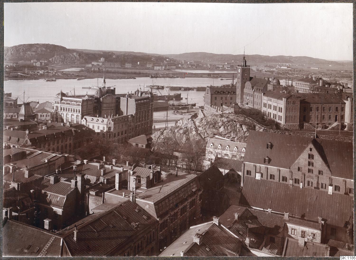 Panoramabild mot nordost från Tyska kyrkans torn med Göta älv och Lundby med Ramberget. Till höger Kronhuset och Navigationsskolan.